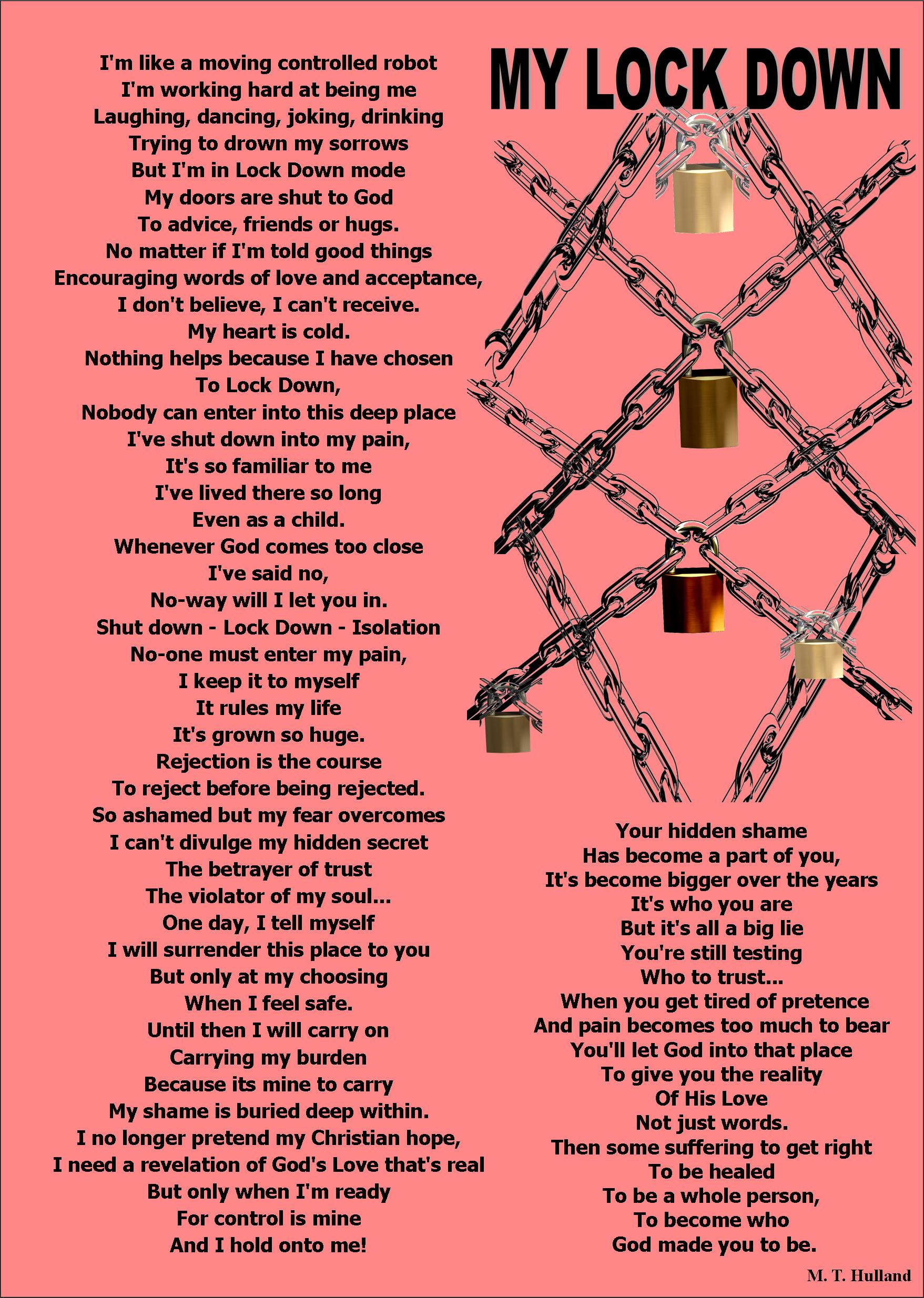 Nowadays it seems that poems come when I'm inspired by God, either through scripture, personal experiences, in a dream or hearing other peoples struggles.